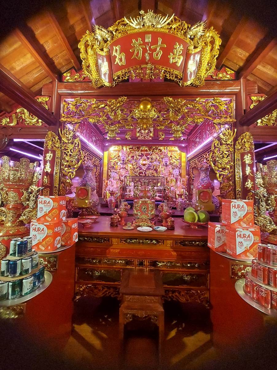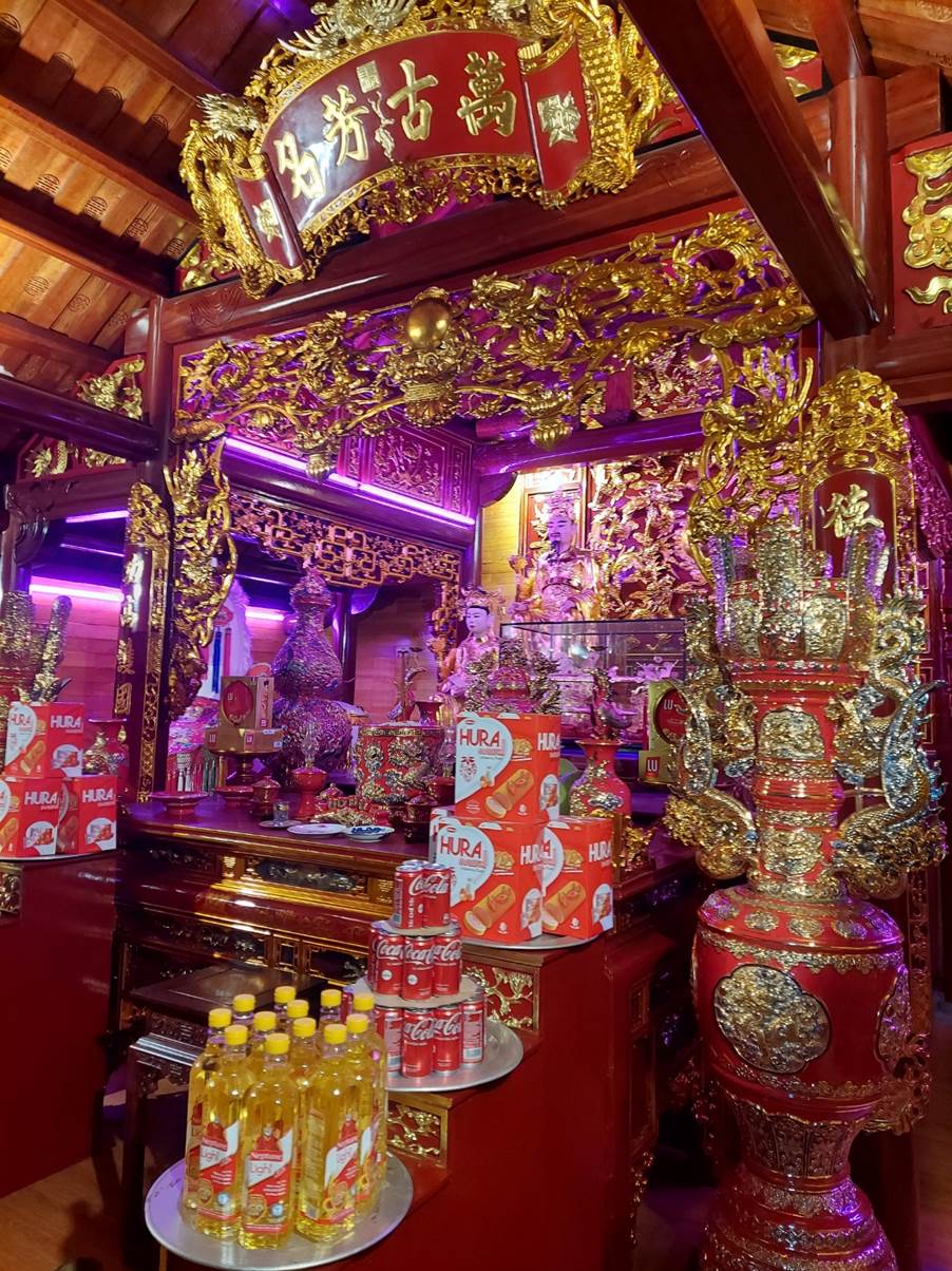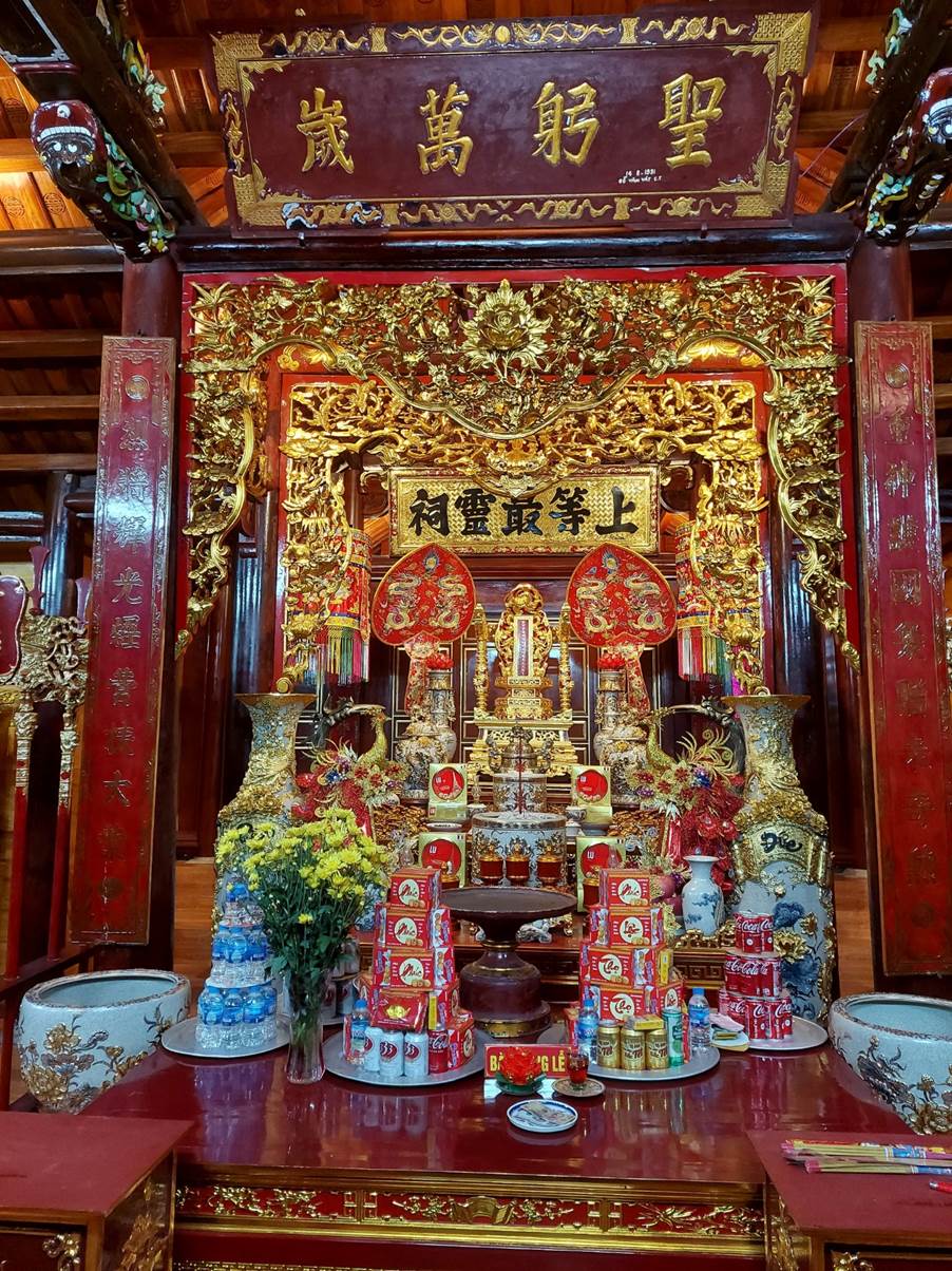 Hậu cung gồm hai gian thông với gian giữa của toà đại đường, trước kia hậu cung được lát dày tạo thành lòng thuyền, các hồi mái được đục hoa văn lá lật, rồng mây chim thú muôn loài. Do thời gian mưa nắng bào mòn gây hư hỏng nặng, lần tu sửa năm Quý hợi 1923, các ván lòng thuyền đã bị tháo dỡ và sửa lại có kiểu dáng đơn sơ như hiện nay. Trang trí nội cung được tập trung chủ yếu ở gian hậu cung. Ngoài những đồ thờ cúng thông thuờng, toà hậu cung gồm hai pho tượng thờ tướng Vũ Hồng và Vũ Thị Lê Hoa đã có công đánh giặc giữ nước.