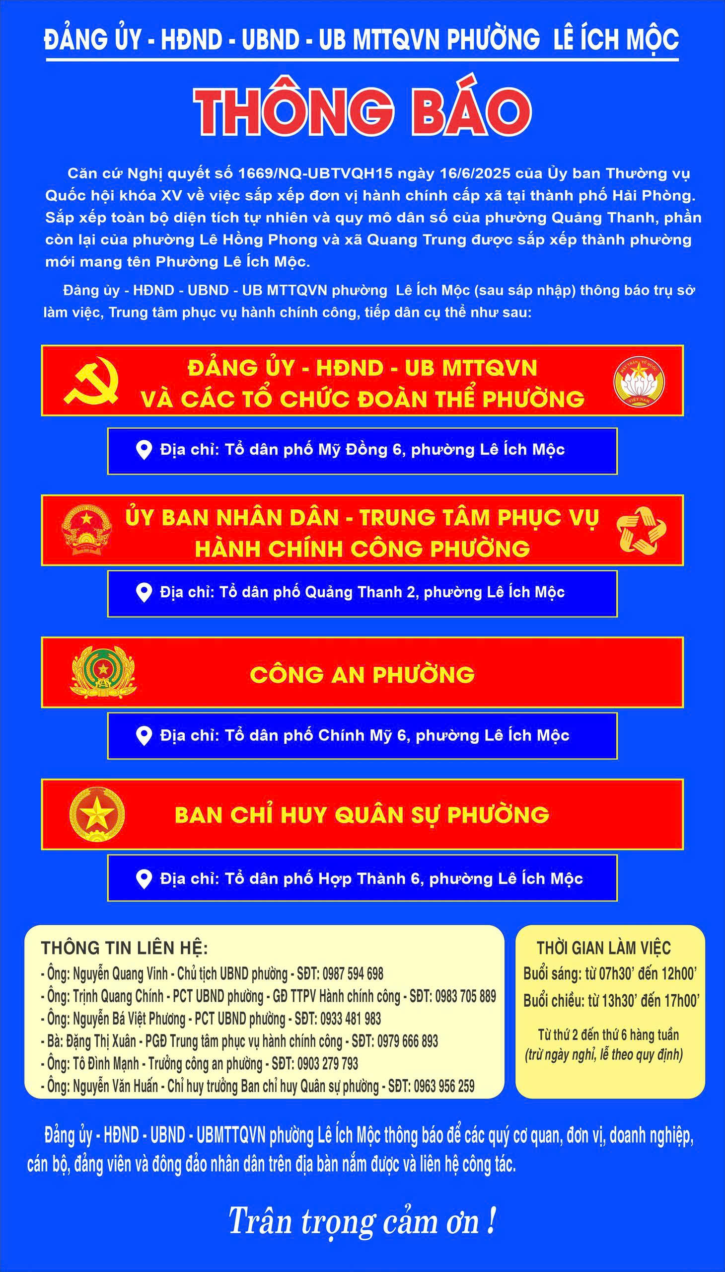 Thông báo Trụ sở làm việc mới phường Lê Ích Mộc