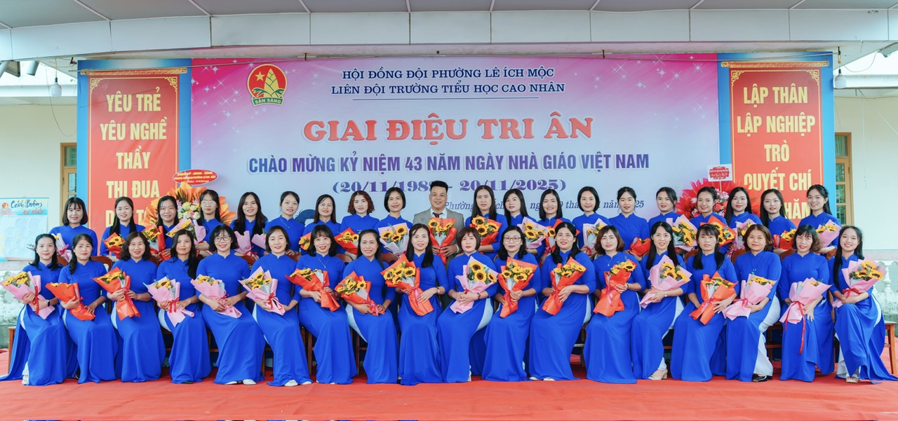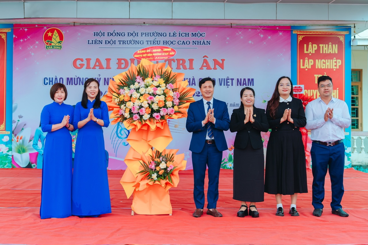 Đồng chí Nguyễn Bá Quế - Chủ tịch UBMTTQ Việt Nam phường tặng hoa chúc mừng thầy cô trường Tiểu học Cao NhânHoạt động thăm, chúc mừng nhân Ngày Nhà giáo Việt Nam 20/11 năm nay một lần nữa khẳng định truyền thống “tôn sư trọng đạo” của dân tộc; đồng thời thể hiện cam kết của chính quyền phường Lê Ích Mộc trong việc đồng hành cùng sự nghiệp giáo dục, chăm lo thế hệ trẻ – những chủ nhân tương lai của đất nước. Những tình cảm chân thành được trao gửi trong ngày đặc biệt này góp phần tăng cường sự gắn kết giữa chính quyền địa phương và các cơ sở giáo dục, tạo nền tảng quan trọng để phường tiếp tục xây dựng môi trường giáo dục văn minh, hiện đại, chất lượng.