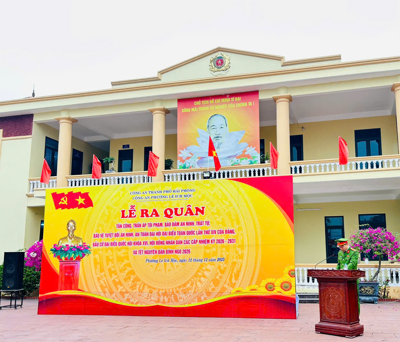 Thực hiện Kế hoạch số 1876/KH-CAHP-PV01 ngày 08/12/2025 của Công an thành phố Hải Phòng về việc mở đợt cao điểm tấn công, trấn áp tội phạm, bảo đảm an ninh, an toàn Đại hội đại biểu toàn quốc lần thứ XIV của Đảng, bầu cử Đại biểu Quốc hội và Hội đồng nhân dân các cấp khóa XIV nhiệm kỳ 2026–2031, đồng thời giữ gìn an ninh trật tự dịp Tết Nguyên đán Bính Ngọ năm 2026, sáng ngày 12/12/2025, Công an Phường Lê Ích Mộc tổ chức Lễ ra quân tấn công, trấn áp tội phạm trên địa bàn.